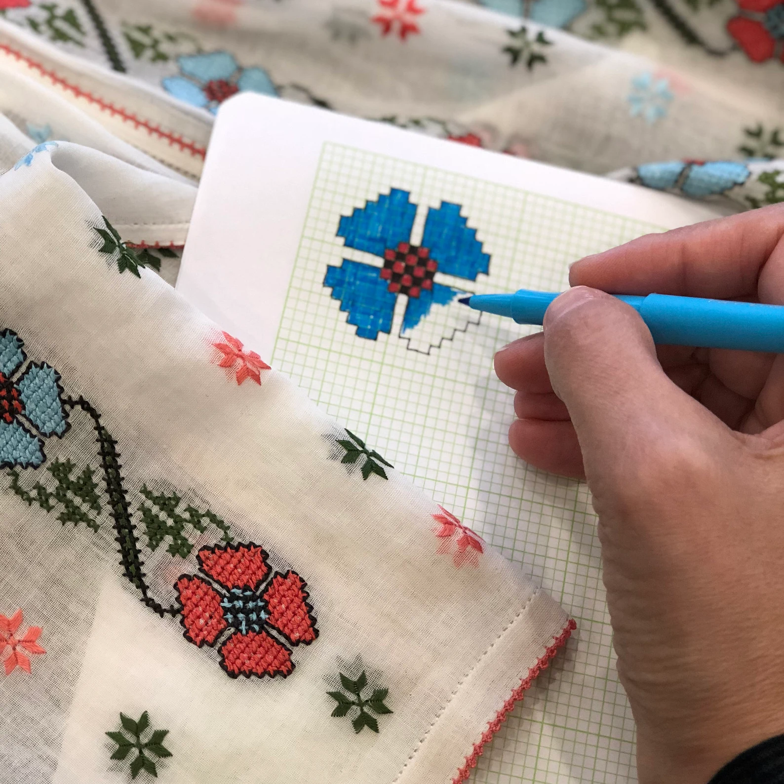 This pattern was adjusted for the round shape of the embroidery hoop and the colours were slightly modified.