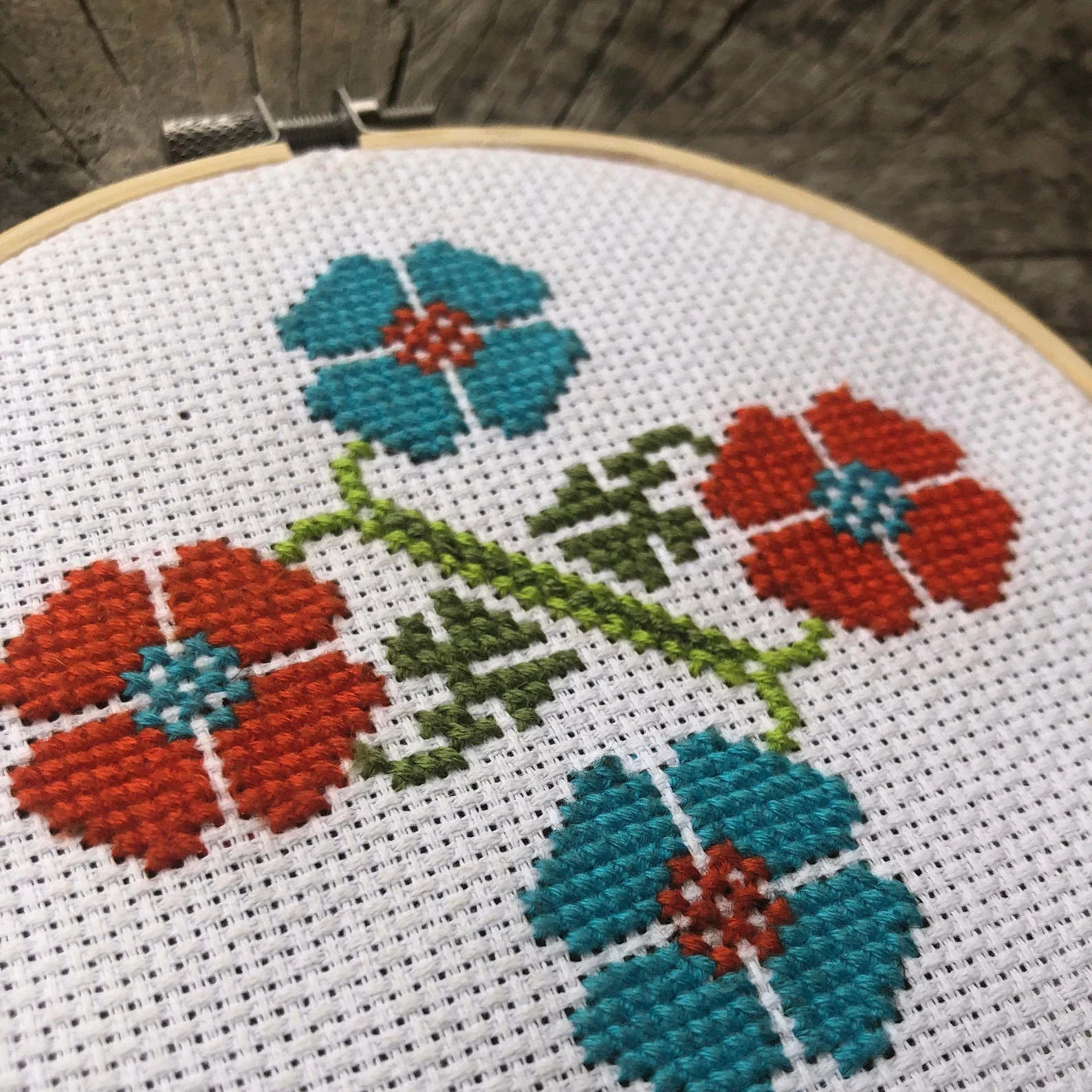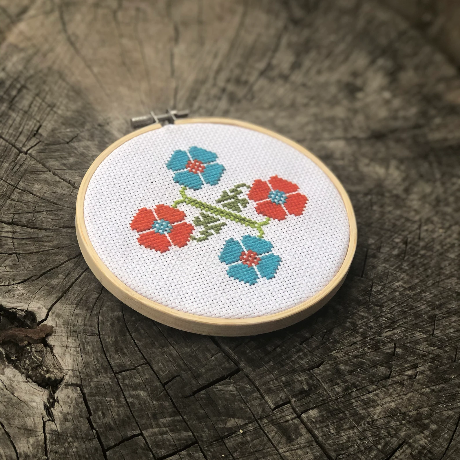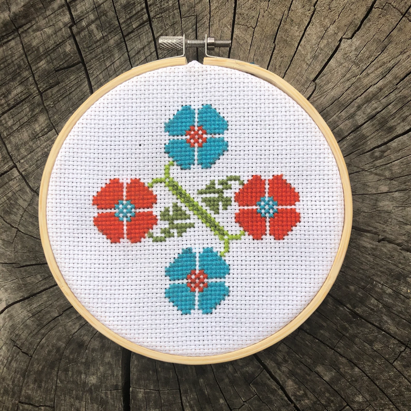 This design was stitched on 14 count white Aida cloth with 4 strands of embroidery floss and it was mounted on a 5 inch embroidery hoop.